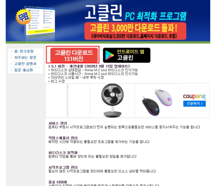 2. 고클린 홈페이지에 접속했다면 고클린 다운로드 151 버전을 클릭합니다