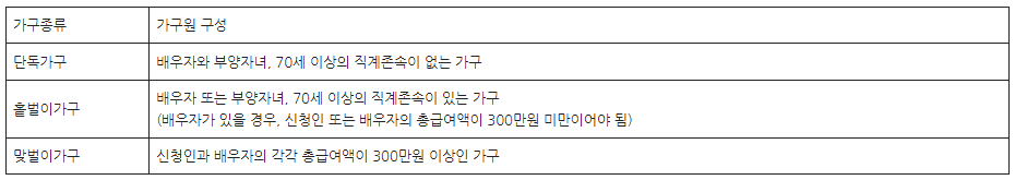 가구 종류에 따라 소득요건은 아래 표와 같습니다